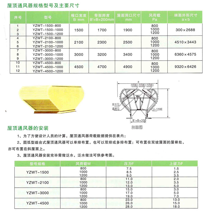按喉口宽度B,屋顶通风器可分为四种类型;而按风荷载的取值不同,每种尺寸又分为三种风荷载规格,故本屋顶通风器共有十二种规格,规格型号及主要外形尺寸见表。