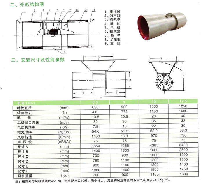3、 该风机工作时,将隧道内的一部分空气从风机的进风端吸入,并以较高的动能从风机的出风端喷出,喷出的气流将能量传达给隧道内的剩余空气,推动隧道内的有害气体顺风机喷射气流的方向排出隧道,在此同时流入新鲜空气,降低隧道内的一氧化碳浓度,提高隧道的可见度。