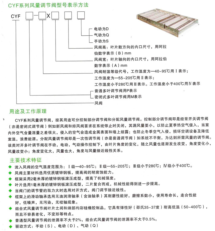 CYF系列风量调节阀是我公司集国内外同类产品的优点,设计、研制成功的密闭式调节阀。它具有结构简单合理,摩擦阻力小,运转灵活,叶片合成后机械性能好,耐腐蚀、泄露率小且适合空气温度范围超过JB/T7228-9411级,达到2800C或4000C的特殊要求。该阀可以广泛应用于工业和民用,尤其是非管道连接的组合联合联动阀,更适合地下通道,地铁,人防等通风排烟系统中。