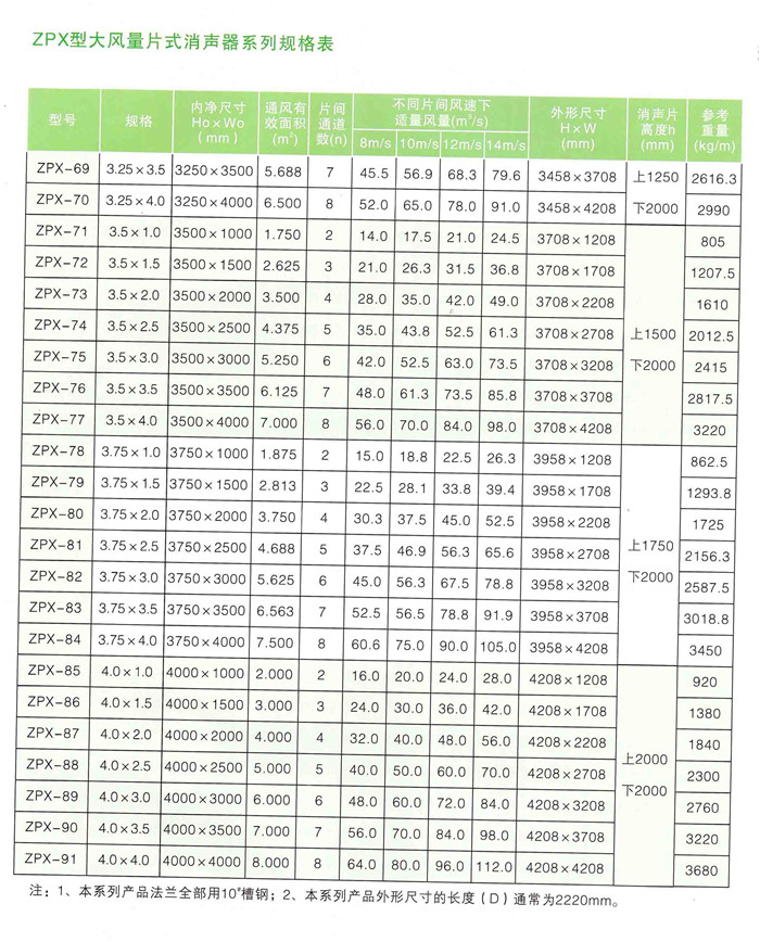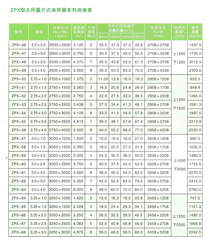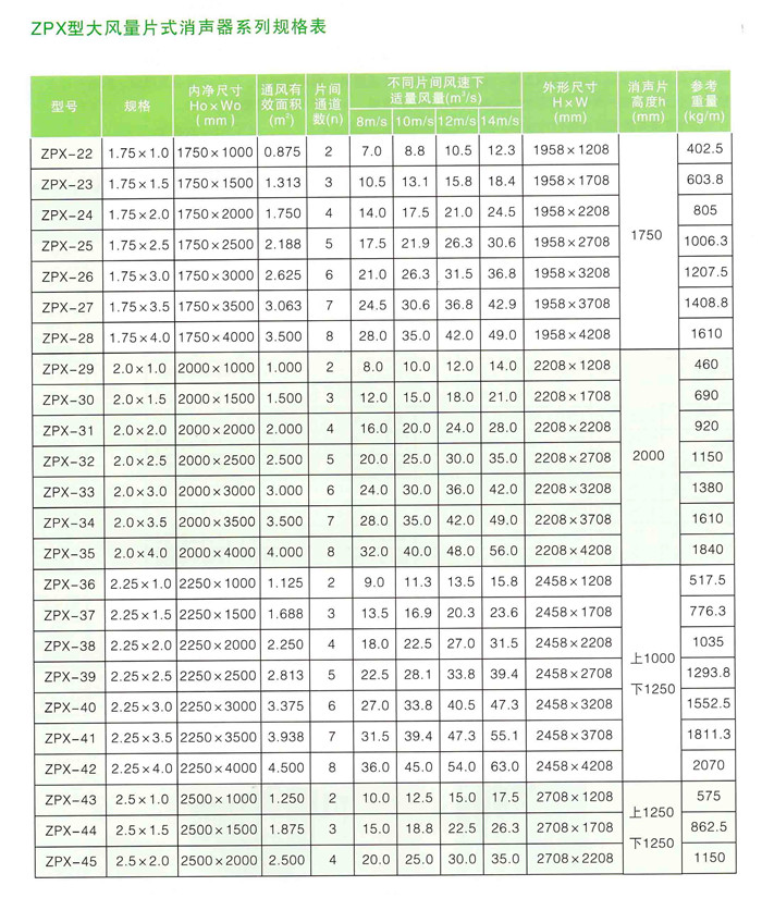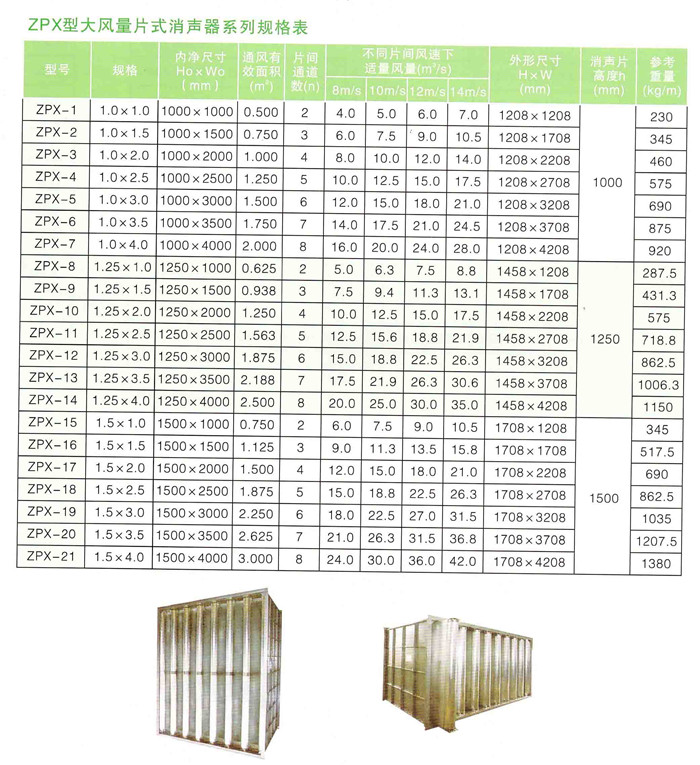 ZPX型消声器系列共有91种规格,消声量≥28dB(A),阻力系数≤1.02,适用风量为4m3/S-112m3/S。