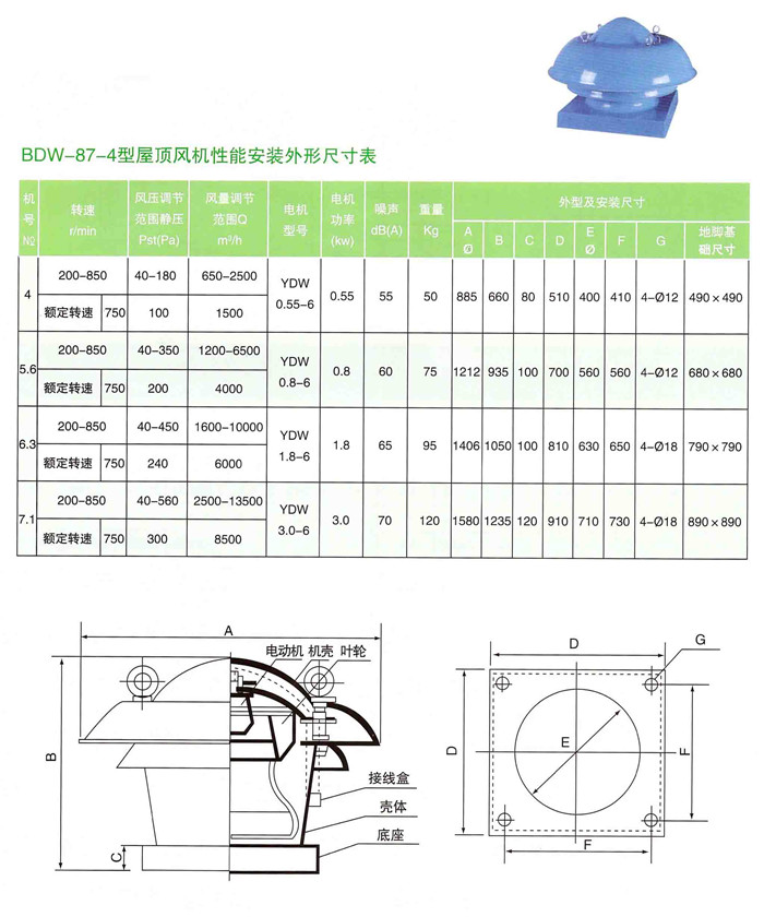 BDW-87-4(亦称作BDW4-75-12)系列风机,选用外旋电机采用无级高速,适用于高压力,低噪音的通风场所。