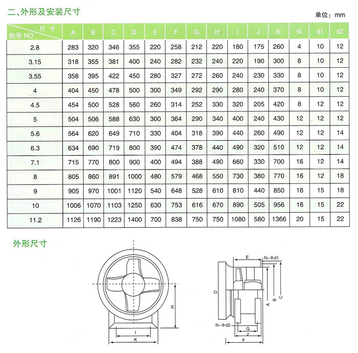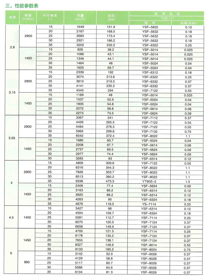 本系列风机有十三个规格,每一规格风机的叶片数都为4个,叶片角有150,200,250,300,350五种,参数范围广,风量826-67890m3/h,风压38.2-460.7Pa(详见参数表)